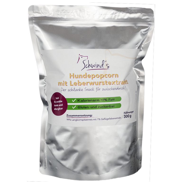 Schwinds Hundepopcorn wird im wiederverschließbaren Frischebeutel geliefert – 300gr.