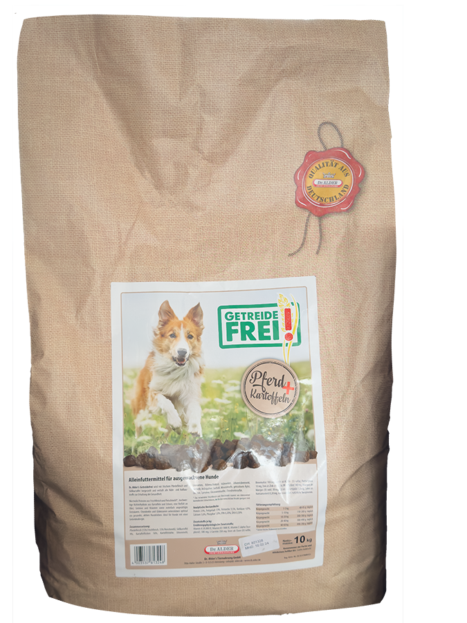 Aber auch für alle anderen Hunde ist Dr. Alder’s getreidefrei Pferd und Kartoffel ein Genuss!