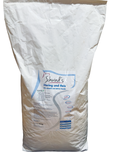 Schwind’s Hering & Reis ist ein hochwertiges Alleinfutter ohne Gluten, Weizen, Mais oder Soja. Durch sein wertvolles Eiweiß ist es auch für Junghunde, aktive und sogar sensible Hunde geeignet.